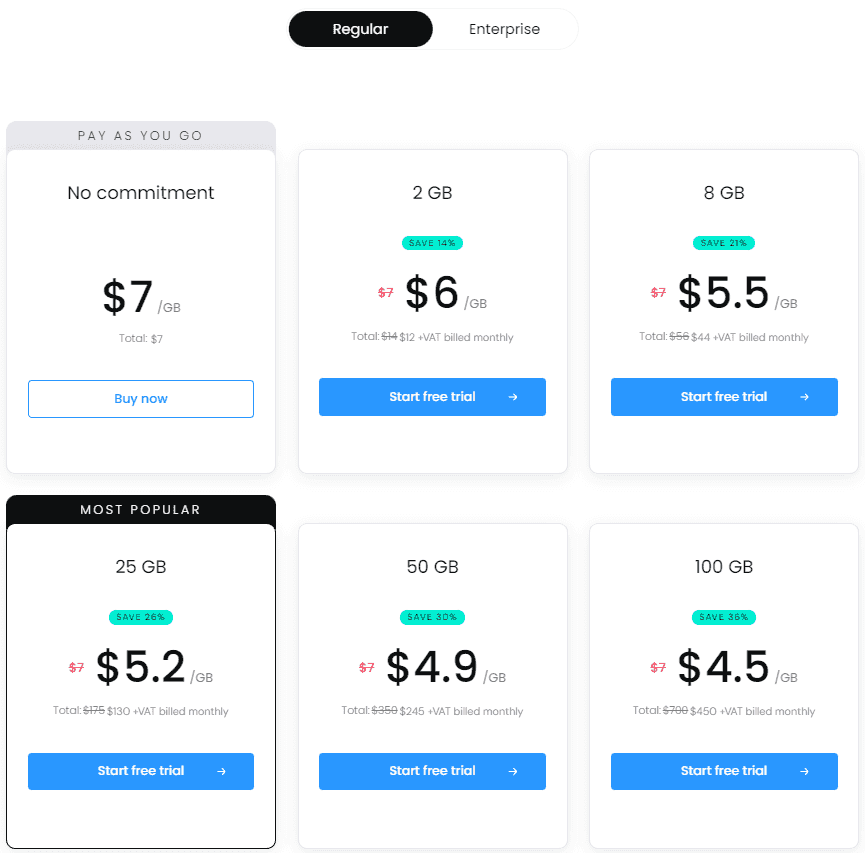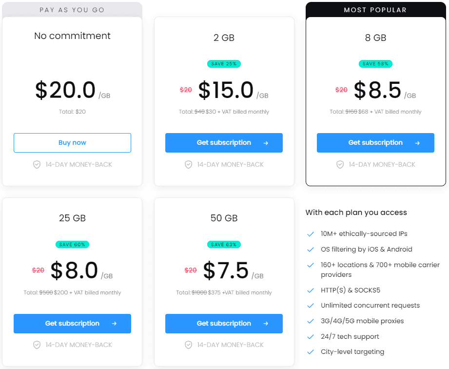 如果您对移动代理感兴趣 ,您可以以 7.5 美元/GB 到 20 美元/GB 的价格购买,具体取决于您选择的套餐。
